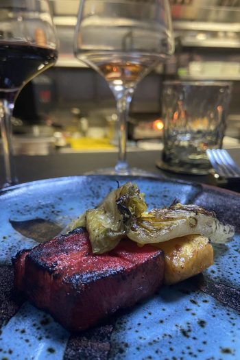 Chicken oysters are barbecued longer than they needed to be, with freeze dried sweetcorn, a burnt corn purée, and, I think, garlic powder. It’s the weakest course of the meal, and we’re later told it’s coming off the menu soon. Then the sweetbread nuggets not unlike KFC’s popcorn chicken in taste and texture, coated in a lurid hot sauce made from chilli and cabbage, to be eaten from the ceramic skull as if some cannibalist ritual. It delivers in way more than shock factor; the sauce is balanced, not overly fiery. It’s playful but above all tasty. A delicious Char Sui pork course with cabbage and pineapple is unctuous, salty, and sweet, followed by a take on mutton and dumplings using lamb neck that I’m still unsure what to think of.