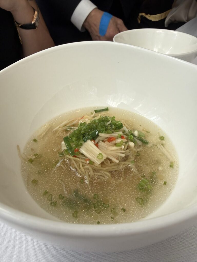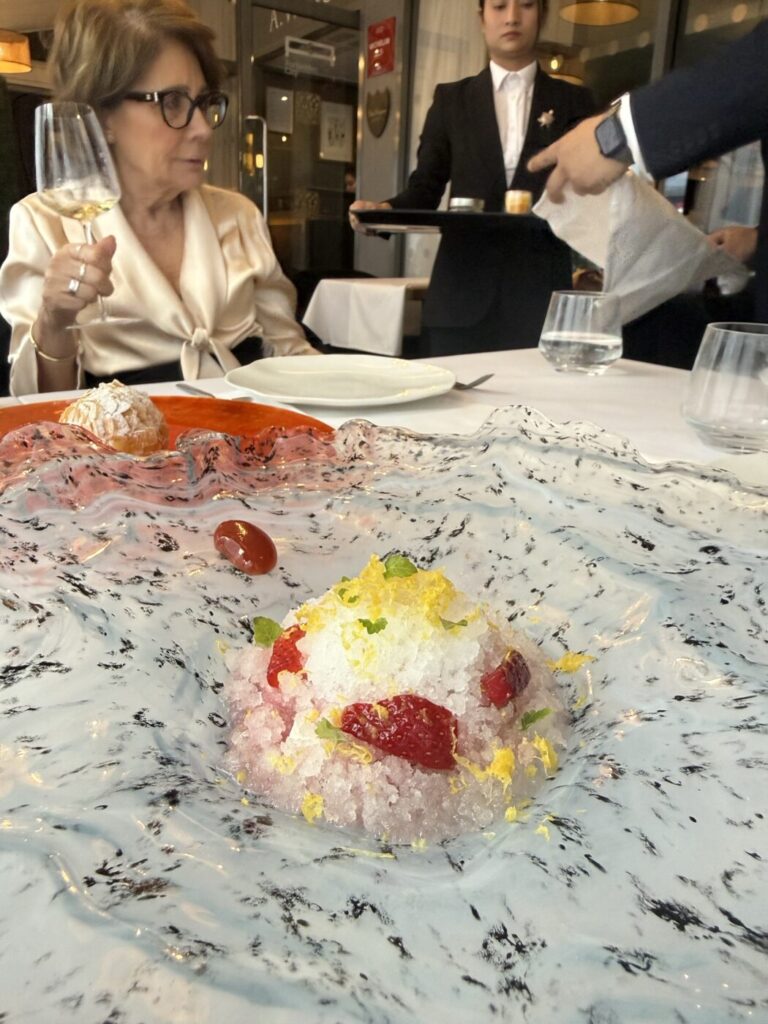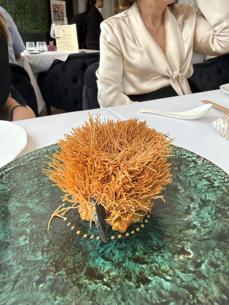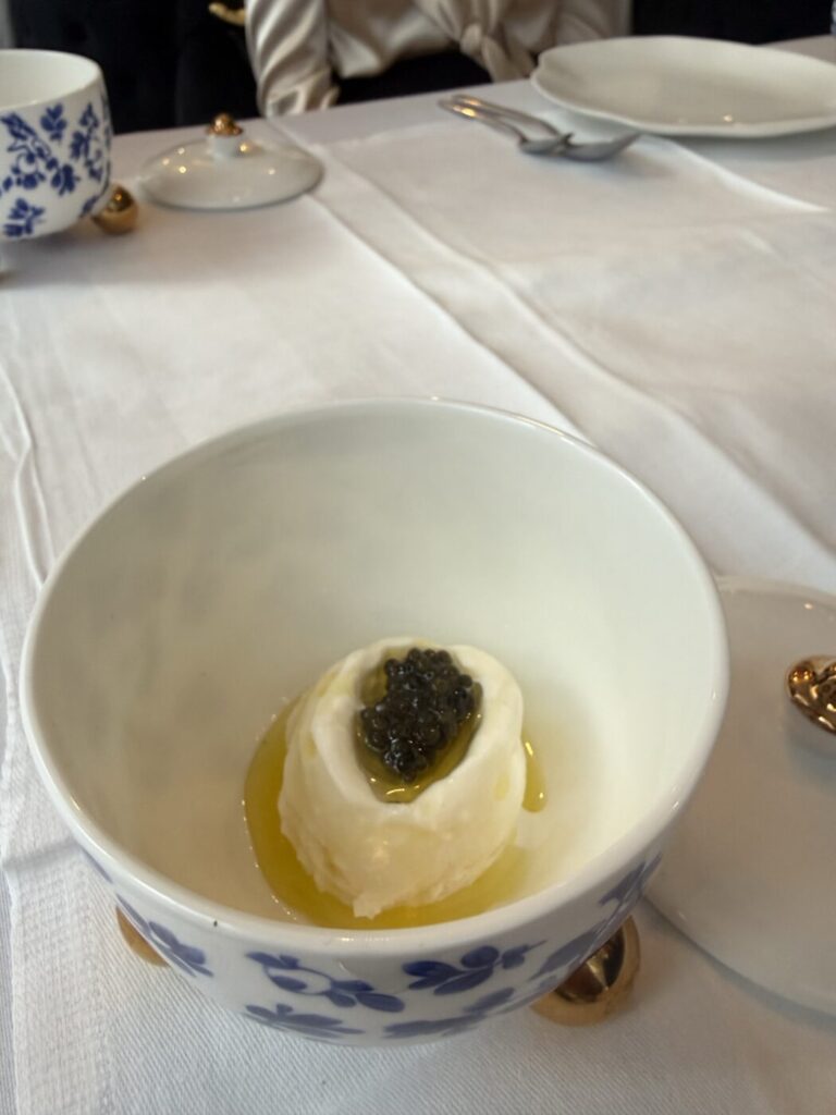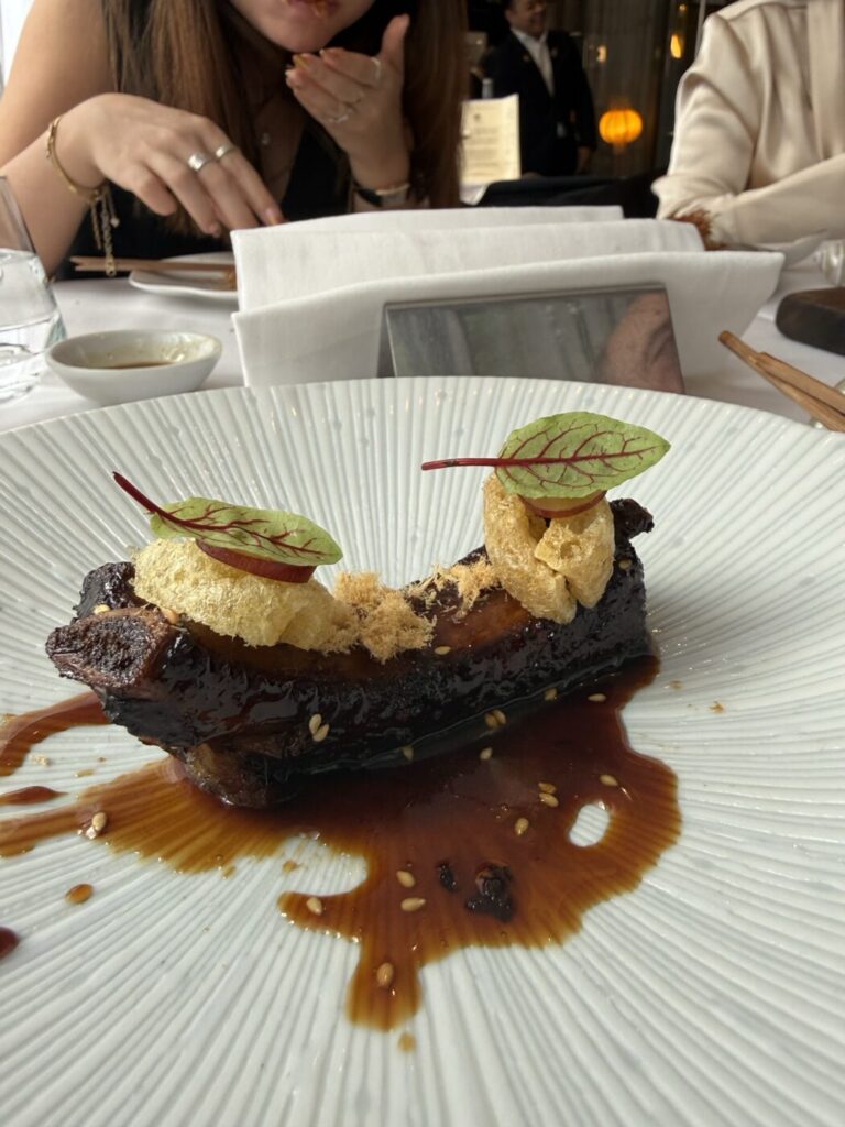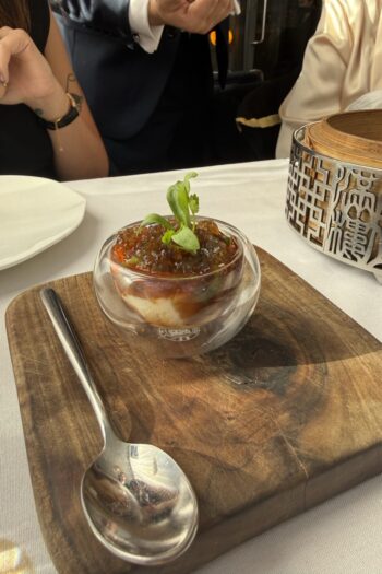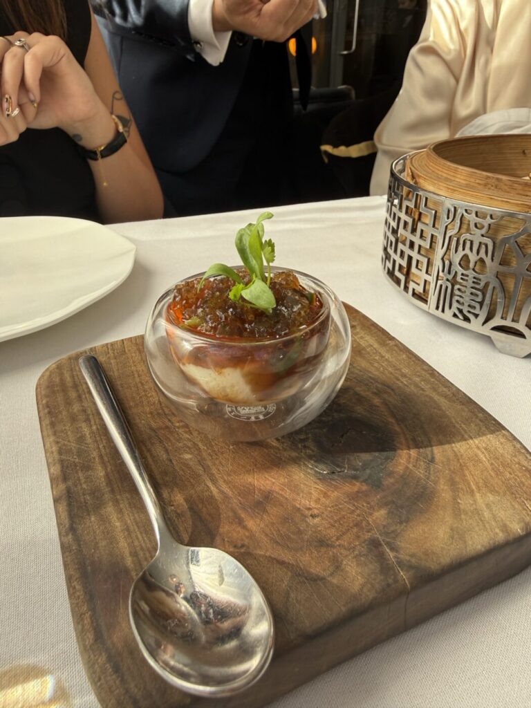 It’s at this point I have a bit of a whinge when they ask how the meal is, pointing out that forgotten or incorrect dishes don’t really match up to my expectations of a two star Michelin restaurant. They agree, and the rest of the menu is full of generosity and warm hospitality. The wonton ‘prawn cocktail’ finally arrives, not as a two ordered, but for all four of us to try. It’s sweet and very enjoyable but the carrot flower is too thick. Then four portions (instead of one) of the coconut ice cream with olive oil and caviar that three of us love and Sophie hates. Having now eaten two of these I can tell you that it’s one of the most interesting desserts I’ve eaten in years, being bright and saline and barely sweet. There is a bonus dessert in the way of Hong Kong-style shaved ice with bird’s nest. I’ve had birds nest before and whilst I fail to see the point of bird spit, it is apparently very high in collagen, which is a surefire way to get two women to gobble it up. Sophie and her now plump lips gets a birthday cake which looks like four Mahong tiles that’s really delicious, I get an old fashioned made with Peking duck fat, and the ladies order more women. That last forty-five minutes is a dream.