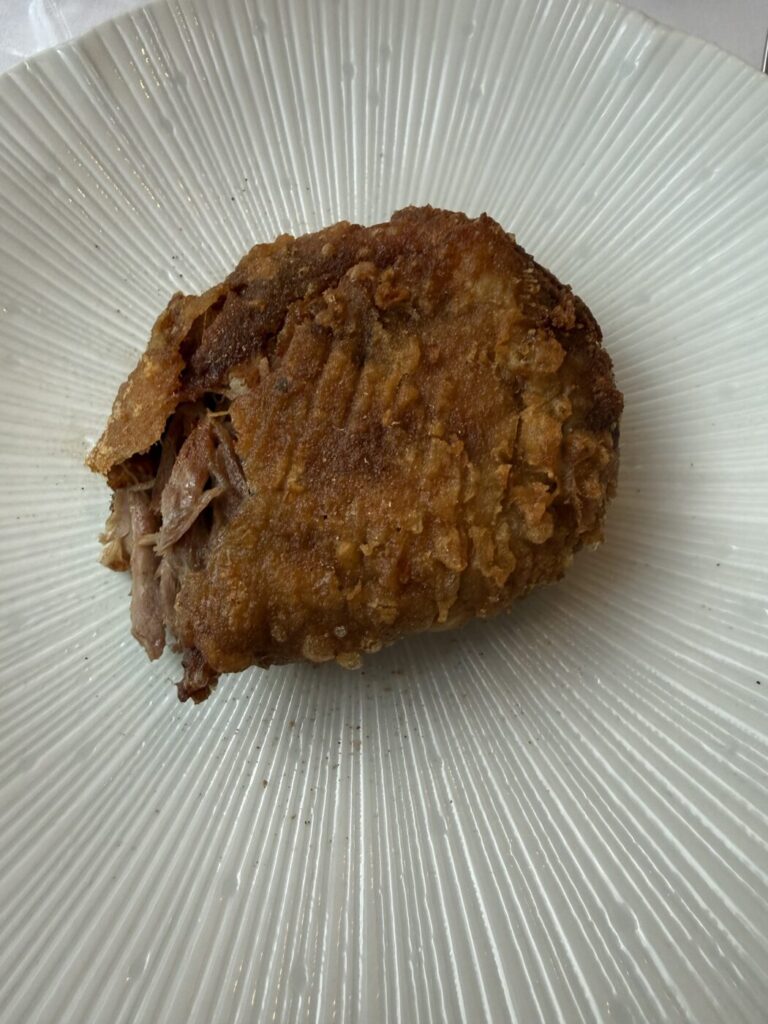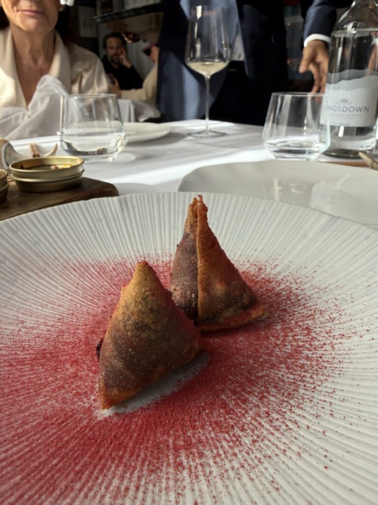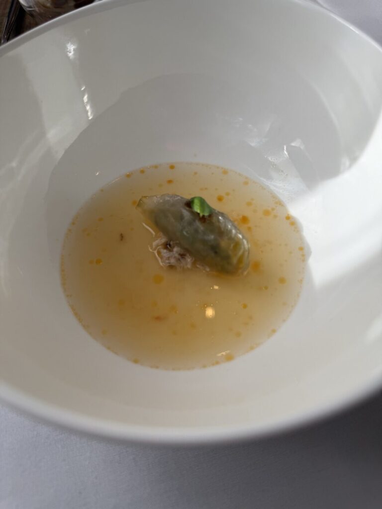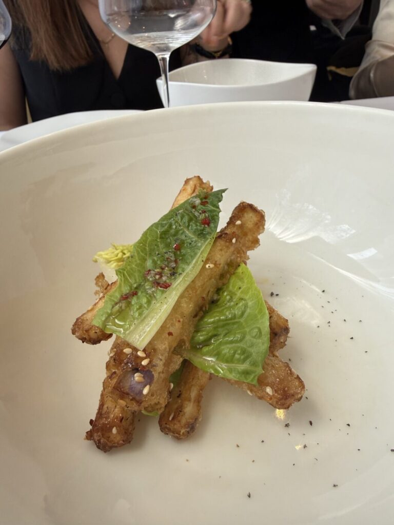 I’ll try to go through the dishes in the order they were received. Crab claw comes in a flurry of kataifi pastry so that it resembles a sea urchin, with a kind of tomato and wasabi concasse at the base. It’s texturally more interesting than the flavour. There is a duo of tiny soy chicken bites that I love, perfumed and saline, with a warming kick of ginger, and a singular pork rib that’s nutty and sweet and punchy at £16.