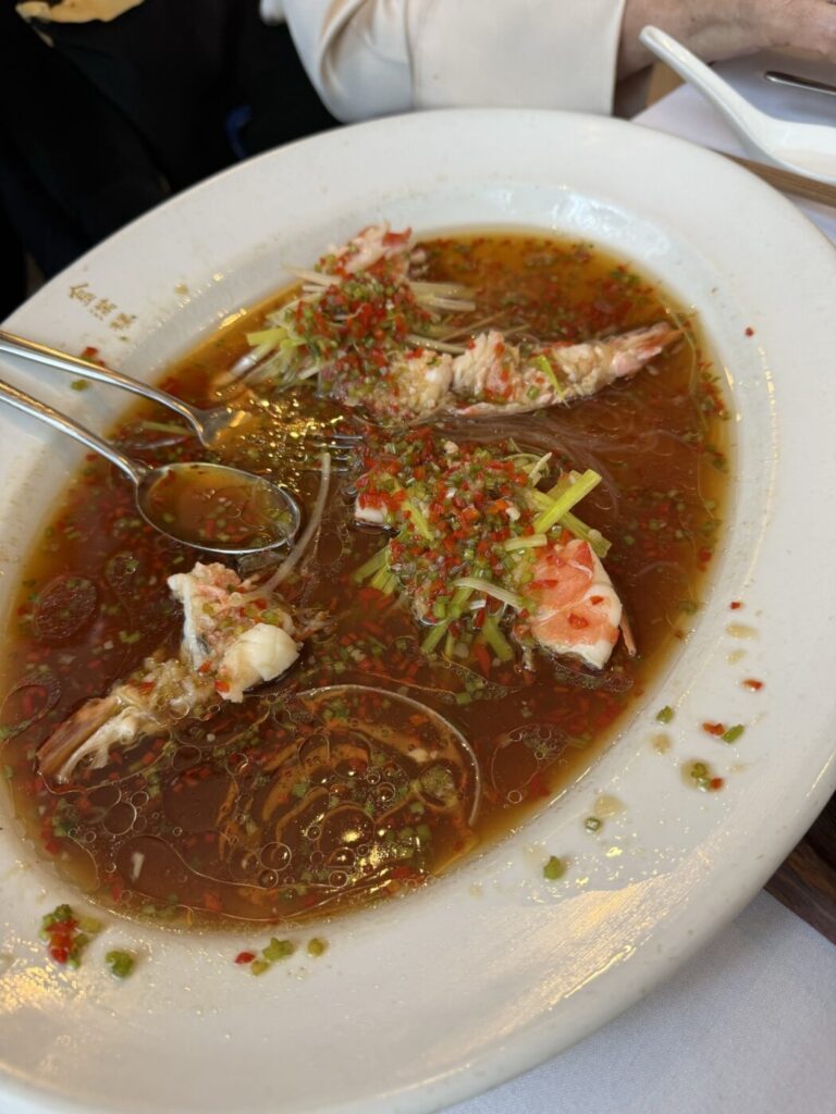 Sophie’s three treasure dumpling with king crab is a beautiful, aromatic, delicate thing that’s also tiny for £15, and she enjoys that a lot more than the pole noodles with the suggestion of crab at the same price. There are genuine fireworks with a two biter sandwich of pork, prawn, and truffle that’s lifted by the sweet and sour notes of plum, less so with the fingers of battered chilli aubergine that really could take more heat. From the bigger plates is fried rice that Sophie and her mother love that promises wagyu beef but delivers the occasional dropping of mince beef, to be wrapped up in lettuce leaf and eaten, and tiger prawns that look the part before they pour over the dressing and make a right mess by flinging it all around. They taste great though. I share some roast duck and pancakes with Tony. I can think of two places in Birmingham that do a better job on the duck and one is five minutes from my home.