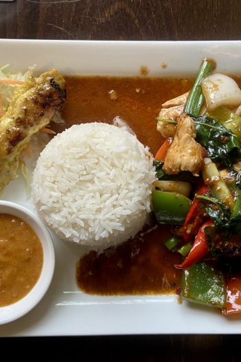 The food is mostly good. Wholesome and with zero pretence, it is a bargain for £11. One has mushrooms on toast that are just like prawn toast in appearance, a touch sludgy in texture but with decent flavour. It shares its space with rice and yellow curry, bright with garlic and lemongrass, the feeling is that they aren’t cutting corners here with the base ingredients. It’s a good yellow curry, not ground-breaking, but the result of a well-made paste and quick cooking of the meat. The other plate has two meagre chicken skewers with a very good satay sauce, more rice, and a stir fry of chicken with holy basil, garlic, some veg, and chilli. All of it can be found better elsewhere, though at a combined price of twice, maybe thrice, this price.