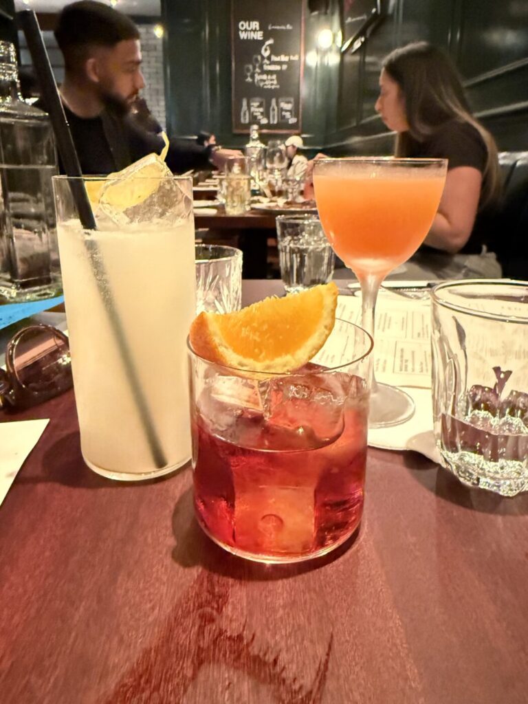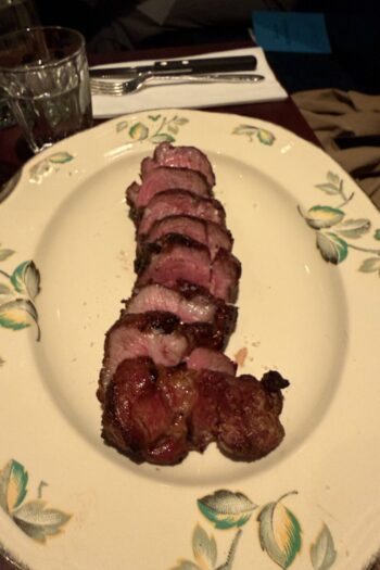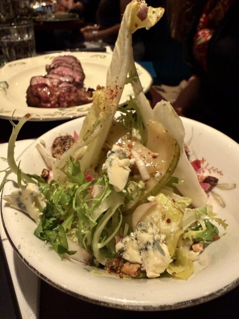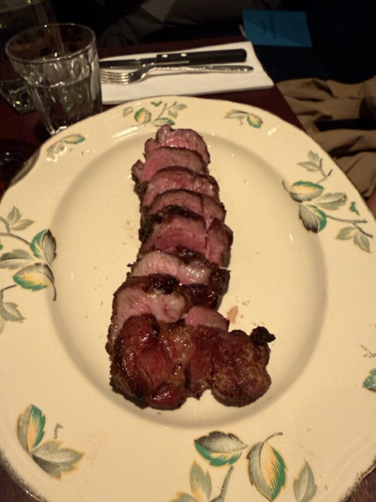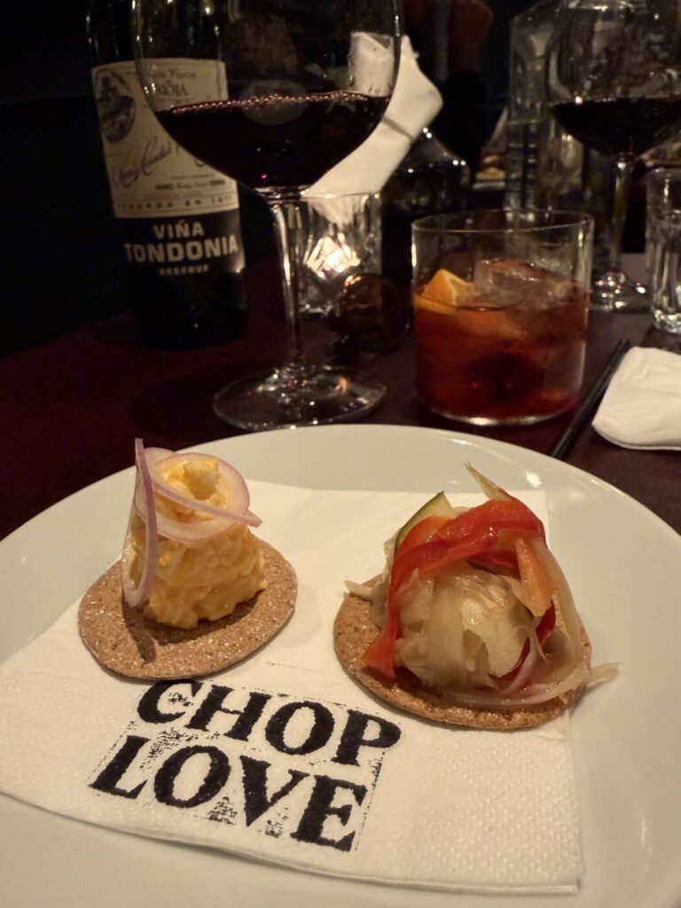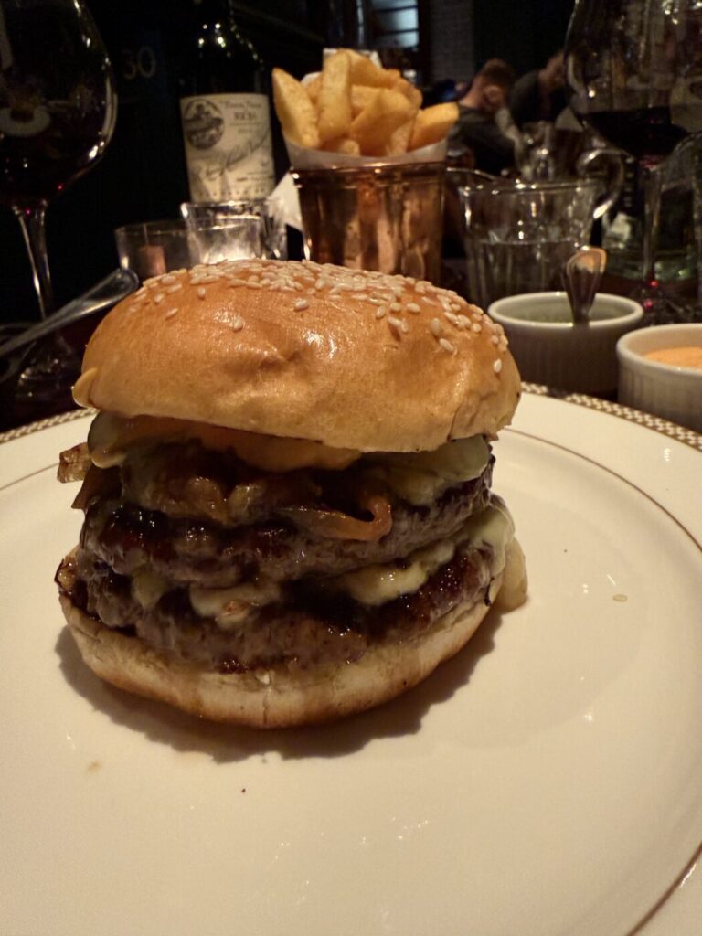 We don’t go too mad on the food. I know that in the effort of doing this properly I should be doing the ‘all in’ on the chops, or getting one of the massive chalkboard cuts, but numbnuts here has done back-to-back tasting menus on the prior evenings, and last nights ended up being way too big for a Wednesday with the kind of mistakes that happen after four bottles of wine. I suppose, if you really care about those, you could just Google my old review. Instead I order two of the bites, Sophie gets a starter, and we kind of share a burger and a chunk of lamb along with some chips and salad. I wanted the pie. They have no pie. It is, perhaps, a reason to go back.