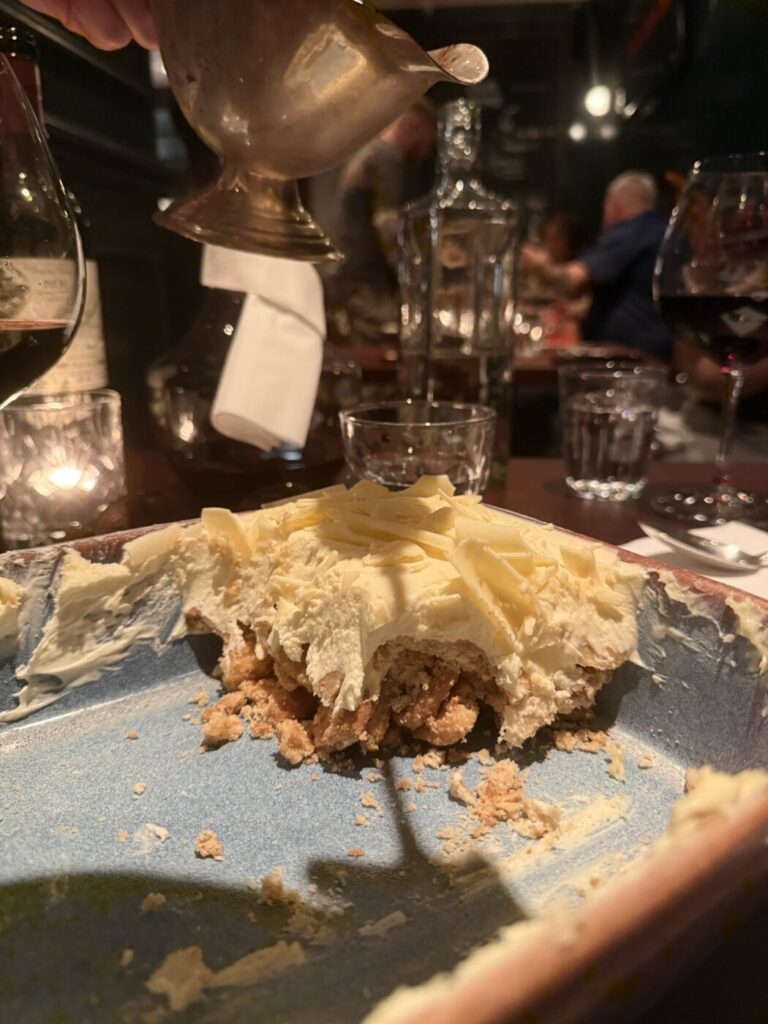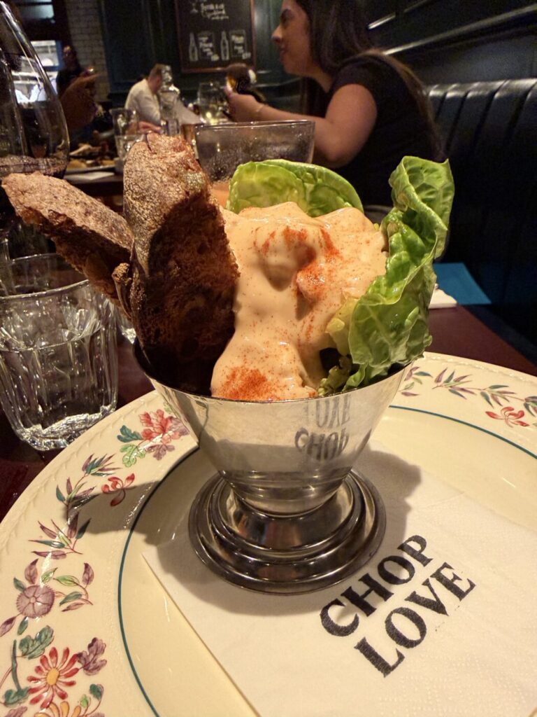 The chop bites are as I remember; a hunk of cheese under crunchy pickled vegetables, and another with whipped egg that I ask for anchovy-less. Sophie has the crayfish cocktail, which they advise to tip out on to the plate and I advise not to. The sauce is well made with a good whack of tabasco and cayenne, and those invasive species are plentiful for the moderate price of £11. The burger is a decent burger, properly sloppy and beefy, the vermouth in the onions comes through nicely. It is not as good as the majestic one at Pasture, which is probably the best burger in the city right now, and an obvious comparison given it is a minute’s walk away. The lamb rump is excellent, really excellent. It takes skill to cook a bit of animal this well, particularly lamb, properly rested and full of flavour. They nailed it. Chips are excellent, as is the gravy, and the chilli hollandaise, and the green sauce. I also really liked the chopped salad with candied walnut, pear, and blue cheese. We share the cheesecake to finish. It would benefit from the base being crushed up more to improve the eating.