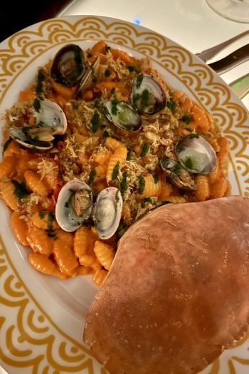 I’d admitted defeat on the main the second it showed up. A huge bowl of pasta with four meatballs the size of squash balls loitering underneath a tomato sauce that has been dialled-up. Most sauces only reach ten. This one goes up to eleven. The meatballs are a blend of ‘nduja and salami, meaty and spicy and so very good. I almost want them on a sub so they can exist in their own space with the sauce and a little cheese, but this is a proper bowl of pasta. Sophie gets the vodka crab, another massive plate of short pasta with crab meat and clams bound in a sauce with a generous glug of vodka that she loves unconditionally. They offer bread. We have no room for bread. They suggest more wine. We do as we are told. We share the giant creme brulee that excels for one key reason; everyone knows the best bit of a brulee is cracking through the top; well by stretching it out, just like the Americans did to pizza, you end up with a bigger surface area of the good stuff and a couple of centimetres of the softer stuff before you hit the base of the dish.