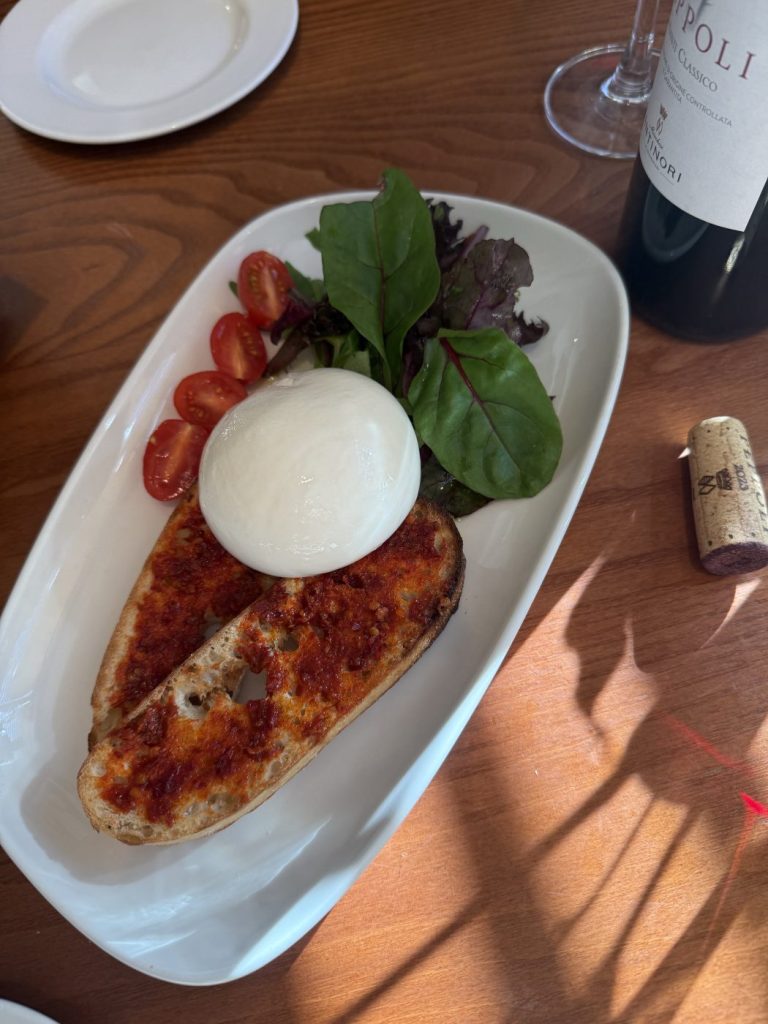 We share a starter of burrata with ‘nduja bruschetta and a little salad. I didn’t realise it then, but it typifies my overall impression of the restaurant. The presentation is simple – I guess deliberately so – with the star being the quality of the produce. The burrata is wonderful; loose and velvety, clearly incredibly well sourced, as was the fiery ‘nduja. It seems weird to comment on a notionary salad, yet here I am, telling you that the tiny detail of properly dressed leaves with vinaigrette is done just as well as anywhere. It’s a small thing, but when you’re dealing with rich ingredients like burrata and ‘nduja, that acidity matters.