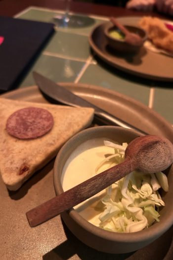 They have a comal in the corner from which the starters come. Baja taco, with beer battered cod, is a light, chunky fish finger, to be rolled-up in a wheat tortilla filled with pickled cabbage and habanero cream. And tetela, a Mexican triangle straight out of The Sims again, filled with a chorizo and potato mix. Both are mild mannered – the tetela way too much so – in need of the various salsas that wind up the sides of the candle holder. These salsas are constantly replaced throughout the meal. If there is any value at Fonda, it is here.