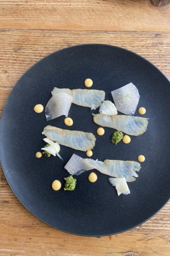 I’ve come for lunch where five surprise courses total fifty quid, excluding that mushroom tart which I’m hoping shows up again but know deep inside that it won’t. I don’t know much about GL50 other than Chris from PX and Tarts thinks that chef patron Jonas Lodge can really cook and it transpires that Chris, once again, is correct. It’s deeply complex cooking and every plate has a lot going on. I would later find out that Jonas has worked in some very serious kitchens across the continent, and has decided to focus firmly on what he can rustle up using produce from this isle. Although there are reference points in the forthcoming dishes that nod towards other chefs, the style is very much of his own.