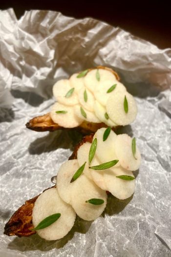 Given that I not long ago wrote about a preview evening here, I’ll spare you the same notes as before and concentrate on the new stuff. There is the beefy broth to start, this time utilising the carrot skins, and the carrot course is still there, which can best be described as the most carroty thing you’ll likely ever eat. It’s seriously good. There is a taco of white beetroot which they’ll likely hate me calling a taco, enclosing goats curd and punchy blobs of rhubarb, at once earthy, sweet, and sour. The artichoke with apple is still the best double mouthful in Birmingham; two, maybe three star worthy on its own. The sourdough starter fried to a puffy crisp has wild boar tartare. It’s a texture I’m not mad about. I’m not sure raw boar is for me.