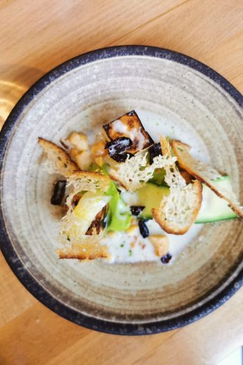 In truth I could be sat in McDonald’s and be overcome from thrill of eating out, but this is special. Really special. The bar menu maintains the essence of the restaurant, stripped back and accessible. The only crossover is the liver parfait with sourdough which is the first dish to arrive. It’s big and brash, full of iron offal notes offset by macadamia nuts and strawberry. Then a light courgette dish with pops of olive and buttermilk dressing which would be the only dish I wouldn’t reorder. The most expensive dish is a scallop that clocks in at £12. The shellfish is cloaked in lardo and nestled in a puddle of gazpacho water; a clean, fresh essence of tomato, garlic, and red pepper. It quickly disappears. We drink the last of the liquid direct from the bowl.