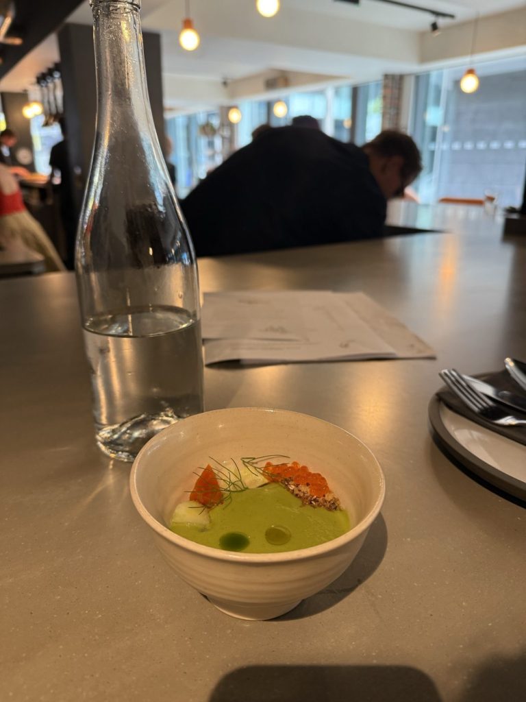 The first course to come out is just superb. A cold green soup, almost vichysuisse-like in flavour, with breadcrumbs, trout roe, and batons of raw veg. It’s that perfect kind of set-up; fresh and purposeful, each element there for a reason. There are pea fritters, dense and green, under a flurry of grated Quike’s cheddar, and plates of superb bresaola, whipped cod roe, wholemeal rolls, and dressed courgettes covering-up the dignity of goats curd and grilled Tropea onions. The pacing is deliberate, allowing us to work through a number of the excellent red wines they’ve clearly carefully selected.