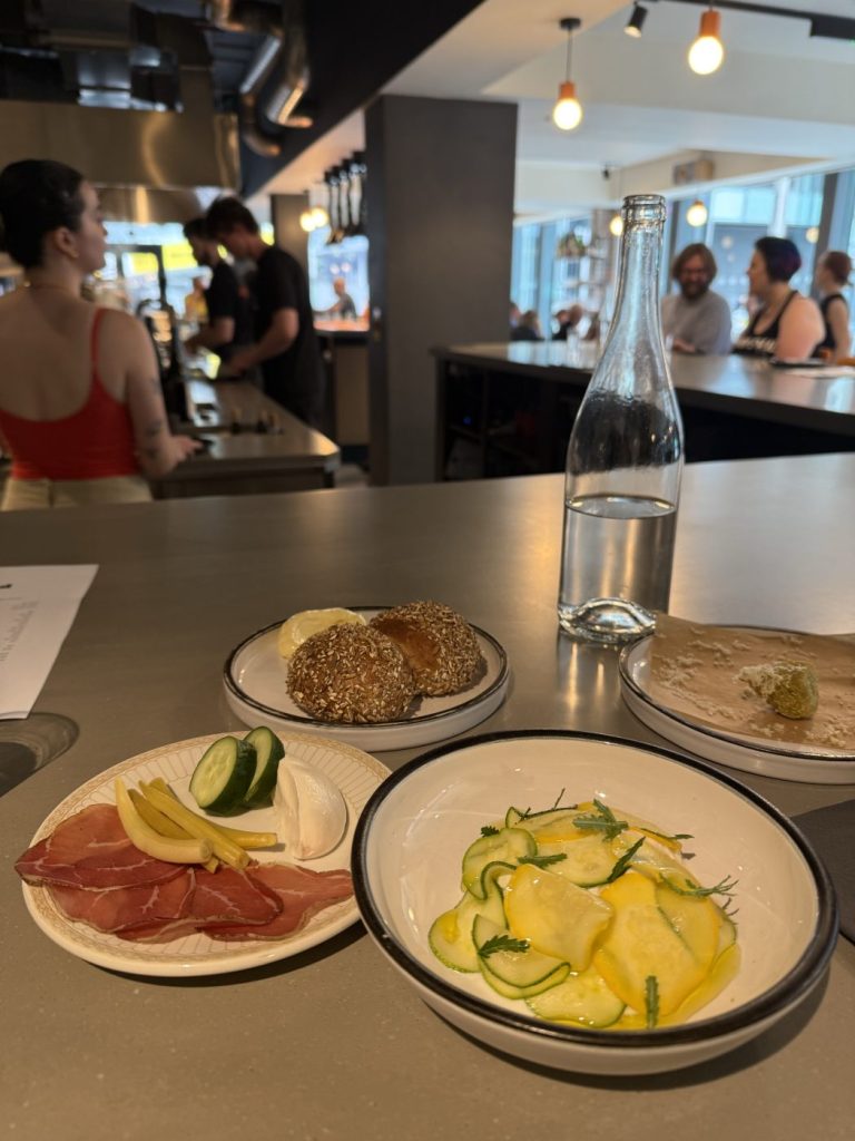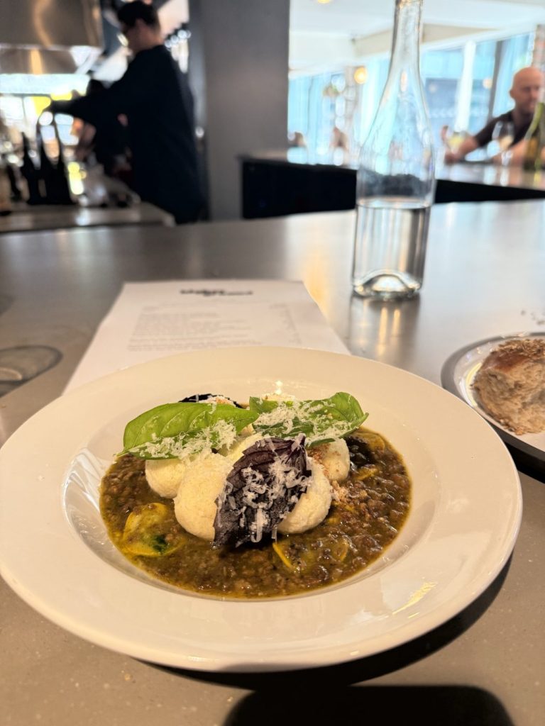 Sophie thinks we’re not cool enough to be here and to a certain extent I can see where she is coming from. It’s very cool. Very New York. Very Mancinian. The room is long and shiny, the wines all natural, and so many pairs of Clarks Wallabees I felt compelled to buy a pair immediately after. It is what an estate agent might describe as ‘buzzy’, or someone much younger than me ‘a vibe’. They have twists on negroni which I enjoy a little too much. We are here for the sharing lunch menu, yours for £40 a head. We supplement it with one portion of the beef ragu with ricotta dumplings for £19.50.