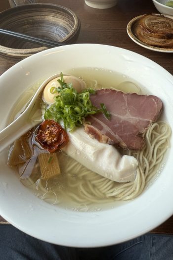 Then there is the ramen, and boy, do we have a lot to unpack here. The broth is gentle, notionally aromatic, and reminiscent of something a Jewish mother would pull out as an offering to make someone feel better. It’s all chicken bones and salt, a delicate, quietly unassuming base for everything else to play off. There’s the poached chicken breast, and the sous-vide pork collar that now resembles gammon in taste. A beautiful marinated egg that is all wobble and loose yolk, noodles that are right in texture, green onions, and a sun dried tomato. It’s a lot. A big salty, umami hit that I get absolutely nowhere near finishing despite really enjoying it. I won’t be drawn into the conversation of who is better between these and Maneiki because frankly we’ve had such awful ramen in Birmingham for so long it’s brilliant to now have two people doing it right in the city. The bill is just over £30 each including a couple of drinks because Matthew booked on a website that rewards booking earlier slots in the evening.