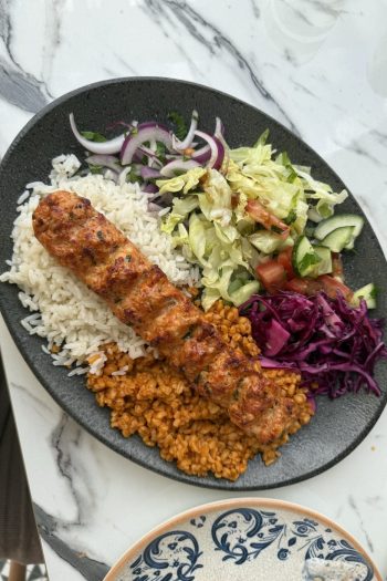 Lunch is a simple offering. A selection of wraps, burgers, and grills, all for under a tenner. We start with hummus which is good, if not spectacular. It has texture, which I love, and crispy chickpeas doused in paprika oil, which I also love, but also so much tahini I find it all tasting a bit peanut buttery. With this is good pide bread. Maybe not the lightest I’ve ever had, but certainly better than most.