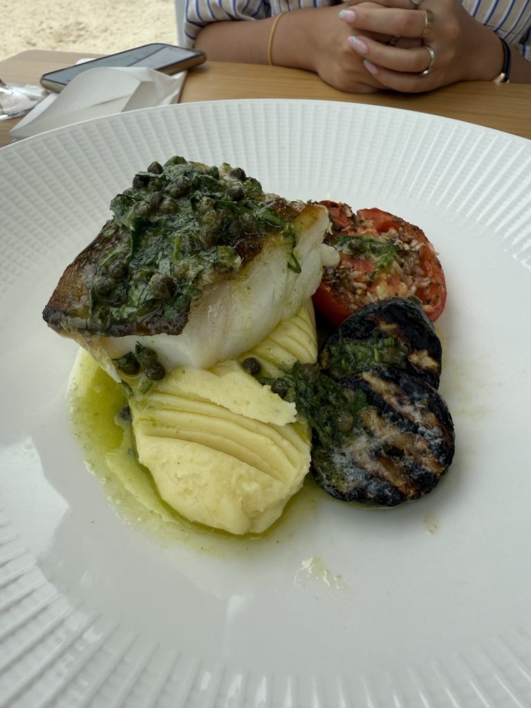 A starter of burrata was a nice study of sweet and sour. The burrata was fresh and delicate, with lightly pickled tomatoes, salsa verde, micro basil, and a big glug of peppery olive oil. Really good, really fresh, approachable and easy to eat. Beautifully cooked cod with olive oil mash, grilled courgettes, roasted tomato, some kind of caper salsa that pins it all together. Nothing fancy. Nothing to rewrite the classics of cooking. Just really excellent fish cooking and an understanding of when to stop.