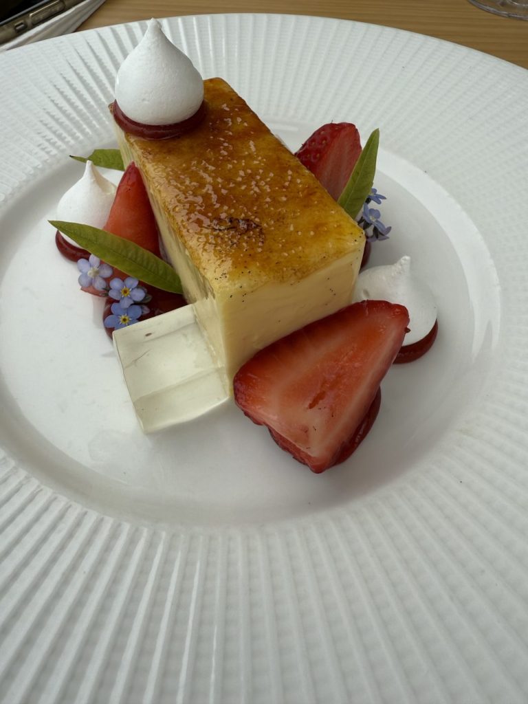 Not sure they could get a better cook on Sophie’s lobster either. Not a hint of chewiness on the meat, just the right amount of garlic present, which is always one clove more than you think. Decent chips, too. The only thing that lets it down is the puddle of dish water coloured liquid that is a mix of the garlic butter mixed with lobster juice. It looks revolting, arguably worse in the flesh than in the pictures. Luckily dessert was pretty as a picture; a creme brûlée that riffs on the flavours of Eton Mess, maybe because a percentage of the dining room are. Loads of vanilla, dainty meringues, fresh strawberries and strawberry gel, and elderflower jelly. It’s sweet and delicious.
