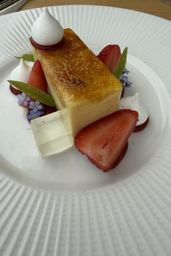 Not sure they could get a better cook on Sophie’s lobster either. Not a hint of chewiness on the meat, just the right amount of garlic present, which is always one clove more than you think. Decent chips, too. The only thing that lets it down is the puddle of dish water coloured liquid that is a mix of the garlic butter mixed with lobster juice. It looks revolting, arguably worse in the flesh than in the pictures. Luckily dessert was pretty as a picture; a creme brûlée that riffs on the flavours of Eton Mess, maybe because a percentage of the dining room are. Loads of vanilla, dainty meringues, fresh strawberries and strawberry gel, and elderflower jelly. It’s sweet and delicious.