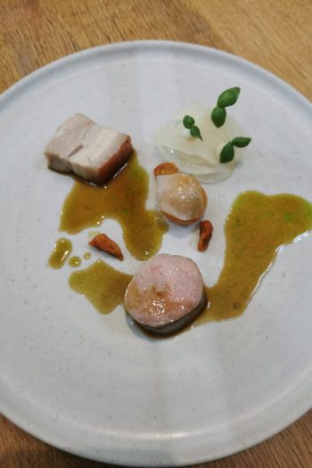 After an intermediary course of Granny Smith juice, sorrel and pickled onions we hit another home run. Pork fillet and belly, tomato with lardo, teeny tomatoes dried out to umami red raisins, onion soubise and pickled. It’s knock out. The fillet, often so disappointing, has a rich sausage-like flavour, and the belly, skin crisped and rich. The sauce, a classic jus split with basil, works to lift the tomato and onion. This is tear inducing two star cooking.