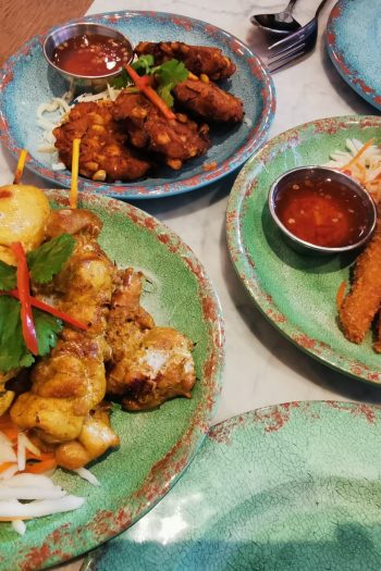 I’m going to disregard that first visit, bar the opinions of those I ate with which will provide reference points. Three weeks on and it’s almost a different restaurant to the one I first ate at, with the exception of the decor, staff, and the menu being full price instead of 50% off. The dips for the crackers are still too diluted and softened, but everything else has improved. The sweetcorn cakes are lighter in texture and less greasy, whilst the satay chicken that was marked down on the first lunch for the lack of lemon grass are now almost furry with the stuff. Crispy prawns have the appearance of a supermarket product but contain plump, fresh shellfish. It’s also the only time that watery chilli sauce works.