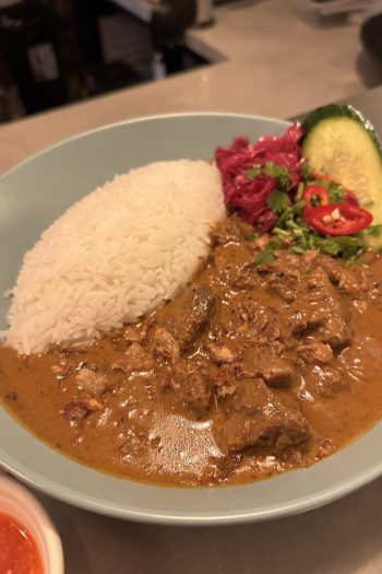 Pork pa lo is more thickened broth than curry, the fatty belly meat braised with an egg that boils hard and discolours to a muddy grey. What makes it is the sauce that coats everything; cinnamon, corriander, a little numbing clove. It’s a little sweet and a lot comforting. It’s also a meal in itself. We finish with an impossible choice of beef massaman or chicken panang curry, both two of the great dishes of street food. We take the massaman, a rich decadent, bowl of slowly cooked beef and the warm hug of spice. It’s impeccable.