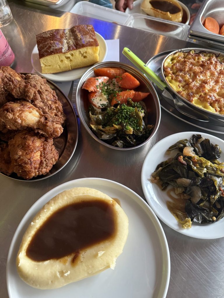 The main event arrives and I can already picture the sleep I’ll be having afterwards. Six huge pieces of fried chicken, nigh-on perfect fried chicken that tastes of actual chicken whilst having a skin full of salt-rich crunch and naughty thoughts. I cannot stress this enough, it is some of the best fried chicken I have ever eaten in my life. Death row stuff. All I want for Christmas is fried chicken stuff. There is a mash potato that has the hazelnut kiss of being blended with browned butter, worked into shape so that it holds the gravy that has the gentle punch of chicken fat running throughout. There are carrots that have been cooked with a glaze of honey and finished with honey butter, collard greens cooked in lard that almost make me like collard greens, a mac and cheese that’s heavy on both mustard and strong cheddar, and scone-like cornbread to mop up the juices. We’re not American, we have normal appetites and a sense of humour. We get nowhere close to finishing it, but I guess that is the point.