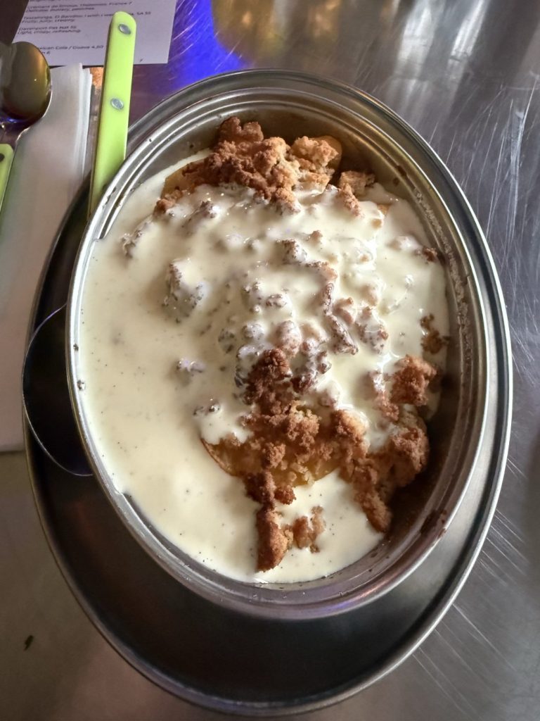 We get cobbler for dessert. Sophie’s never had cobbler before though she soon grasps that it’s basically a clumsily made crumble. The mixture of peach and cinnamon is lovely, but what stands out is the amount of vanilla in the custard. This is proper cooking with zero compromise on ingredients.