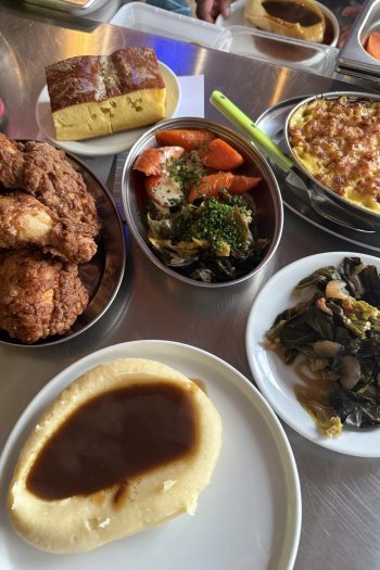 The main event arrives and I can already picture the sleep I’ll be having afterwards. Six huge pieces of fried chicken, nigh-on perfect fried chicken that tastes of actual chicken whilst having a skin full of salt-rich crunch and naughty thoughts. I cannot stress this enough, it is some of the best fried chicken I have ever eaten in my life. Death row stuff. All I want for Christmas is fried chicken stuff. There is a mash potato that has the hazelnut kiss of being blended with browned butter, worked into shape so that it holds the gravy that has the gentle punch of chicken fat running throughout. There are carrots that have been cooked with a glaze of honey and finished with honey butter, collard greens cooked in lard that almost make me like collard greens, a mac and cheese that’s heavy on both mustard and strong cheddar, and scone-like cornbread to mop up the juices. We’re not American, we have normal appetites and a sense of humour. We get nowhere close to finishing it, but I guess that is the point.