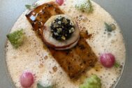 We start with cocktails. I have a cherry negroni that’s fun and would remain a well-made drink if you took away the cherry tree in the ice cube. Sophie has a Shanghai Clipper that would stand-up to most of the cities drinks. Then downstairs to the booth, low lit and buzzy, more than busy enough at lunch. We get the cheaper ‘Moon Stand’ lunch and supplement it with others from the main menu. I’ll keep the two separate from herein to avoid confusion.