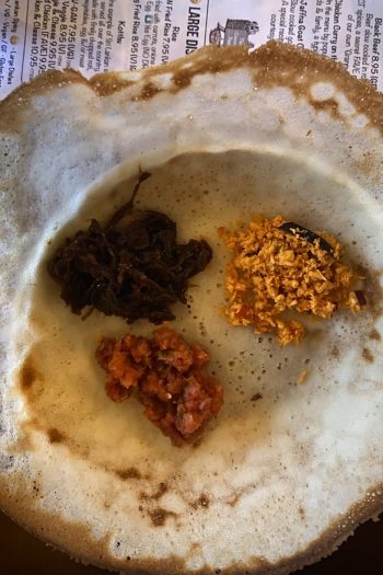 I smoosh the shit out of the hopper and it’s okay, if a little flaccid and damp. The bowl shaped pancake with various sambals can be eaten (and probably should be) on its own, but I happen to like double folding it for strength and applying a little of elsewhere’s order; the stir fried chickpeas with loads of mustard seed go well with the coconut sambal, and whilst the cheesy Colombo feels like an identikit version of just about every paneer in gloopy sauce, it works really well with the caramelised onion.