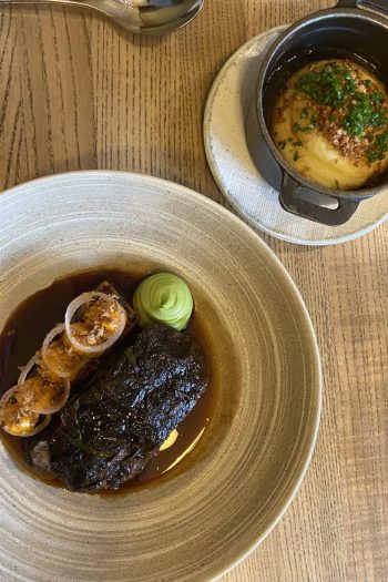 From the off you know it’s a place which takes flavour seriously. Chef John Hookers food has the whiff of Tom Kerridge about it; the flavours are brash and there is a basic understanding of fat, salt, and acidity. A scotch egg of Pheasant shot locally on Dartmoor has the gaminess loosened by the addition of a little pork. The centre yolk is jammy, the outside crispy; it is very much a textbook scotch egg. On the side is a jumble of blue cheese and onions pickled with beer, the idea foil against the richness, of the egg. The other starter is cauliflower soup – a simple blend of veg, stock, cream, butter and seasoning – with nutmeg cream, and a chicken tortellini that could be a dumpling in China Town if I closed my eyes. On the side is a white roll made in-house; soft, fluffy and delicate enough to have its own Twitter account. A superb start to the meal.