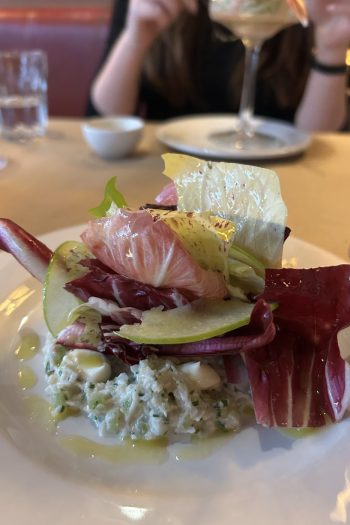 They have a set menu, I doubt you’ve heard of it given it absolutely did not win best value menu at the Good Food Guide Awards. I was there (it’s the reason why we are in London), and I would have absolutely remembered if they had. It’s two courses for twenty-five, three for twenty-nine, with the choices being prawn cocktail for starters, skirt steak for mains, and sticky toffee pudding. Don’t like that value? You can eat a la carte as I did where starters start from eight quid and mains nineteen quid, and even if you went full-on-fancy-pants would struggle to hit £60 for three courses. The prawn cocktail is superb, choc-a-block with them bound in a proper marie-rose sauce whilst a langoustine looks dead-eye with the same sadness as My Octopus Diaries. Equally superb is my starter of crab with bitter leaves, generous and sympathetic with the white crab meat that works off the anise of tarragon and crisp sweetness of apple. The recipe is in The Times. I’m recreating it for Valentine’s Day.
