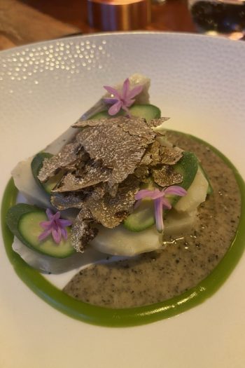 It’s the attention to detail that sets them apart; the laborious techniques that take time and a tight palette. A Chou farci of sorts is stuffed generously with salmon, langoustine, and lobster, with a bisque properly made with flambéed shells and talent. The little Granny Smith Apple is all the acidity the dish needs. The other starter is globe artichoke, its petals cooked slowly in a little vinegar, courgette, truffle and truffle sauce. Hidden under the rubble was an egg yolk cooked slowly to a jam-like consistency, which added a pleasing richness. Neither dish would be out of place in a starred restaurant.