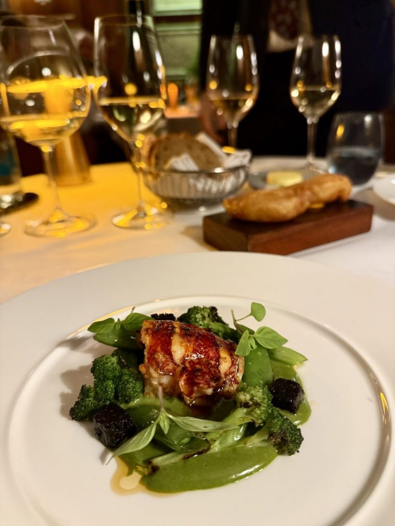 Because the next course is brilliant. So good my wife thinks it will top her extremely sought after top ten dishes of the year. Barbecued lobster tail, Thai green sauce, black pudding from Stornoway, greens from the garden. On the side is a tempura lobster claw with batter so dainty it could crack under a hard stare. I’ve had the Thai green sauce in almost every incarnation since he cleaned-up for Wallace & Torode, but this really feels like it’s his most complete version. Then wagyu. Proper thoroughbred stuff, not the vague relatives that’s everywhere now. Wagyu rump cap, as crimson as a rose petal, with a quenelle of crushed jerusalem artichokes, pickled pear, braised ox cheek, a hash brown with Tunworth and black truffle, grilled mushroom, cabbage brushed in beef fat, black garlic puree, and an absolutely killer beef sauce. Remember when they told you about two or three ingredients and not overcomplicating the plate? Absolute nonsense. This could be Christian Bau in any other world. A dish where the wagyu shines dead centre and the rest play off it with a bit of this and a bit of that like a Del Boy deal. Faultless.