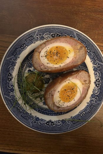 From the snacks is bouncy focaccia, peppered with verdant extra virgin olive oil and served with a wild garlic butter and whipped pork fat. I don’t even need to tell you which one is best. Padrons, blistered under a drift of maldon salt, and a pair of tiger prawns with a sriracha chef has made in-house because he didn’t like the other options, finished with a spicy oil from the heads because the man is a genius. And the scotch egg, that fucking scotch egg. Straight to number one in the official scotch egg chart; above the one at The Hinds Head, above the one at The Devonshire. Served with a gerkin pickle that Anita correctly identifies as blitzed-up Indian pickle of some kind. Chef is going to be making a lot of scotch eggs, let me tell you that much. I’ll be eating most of them.
