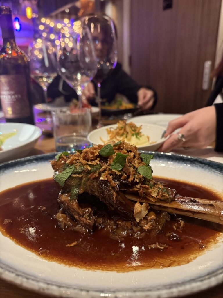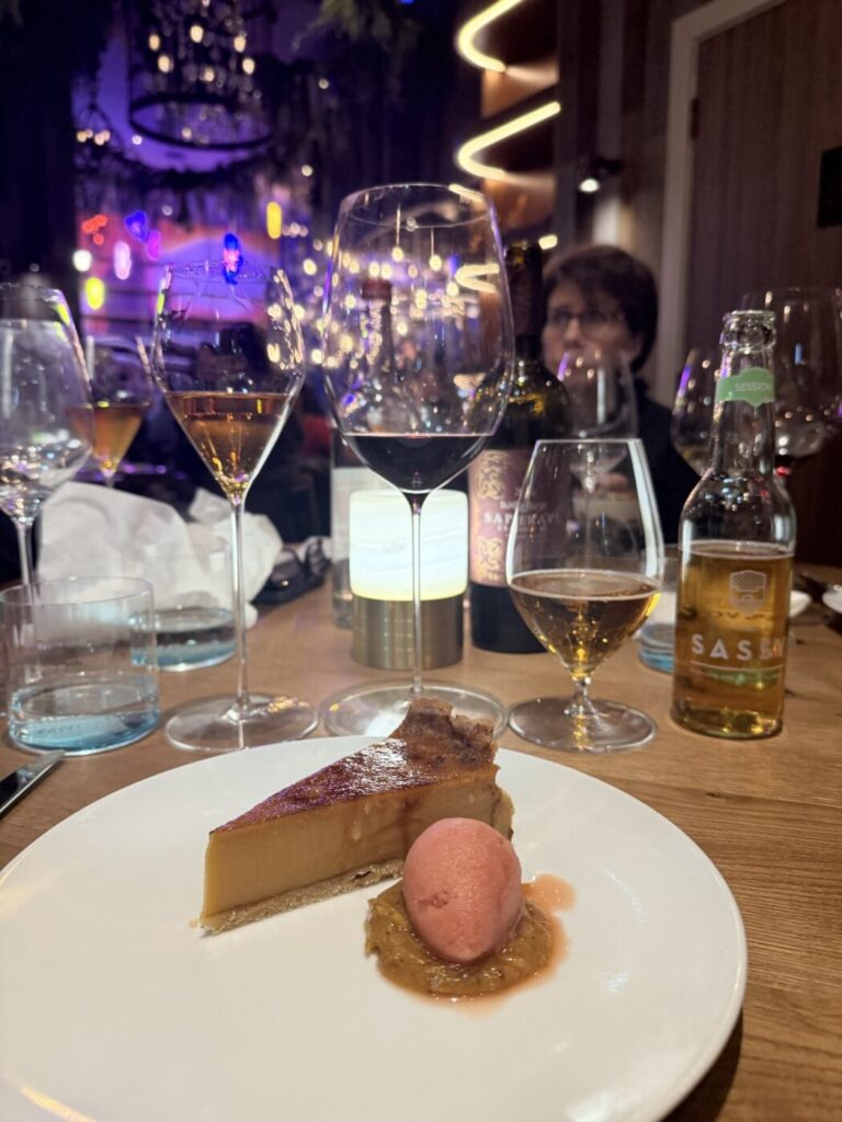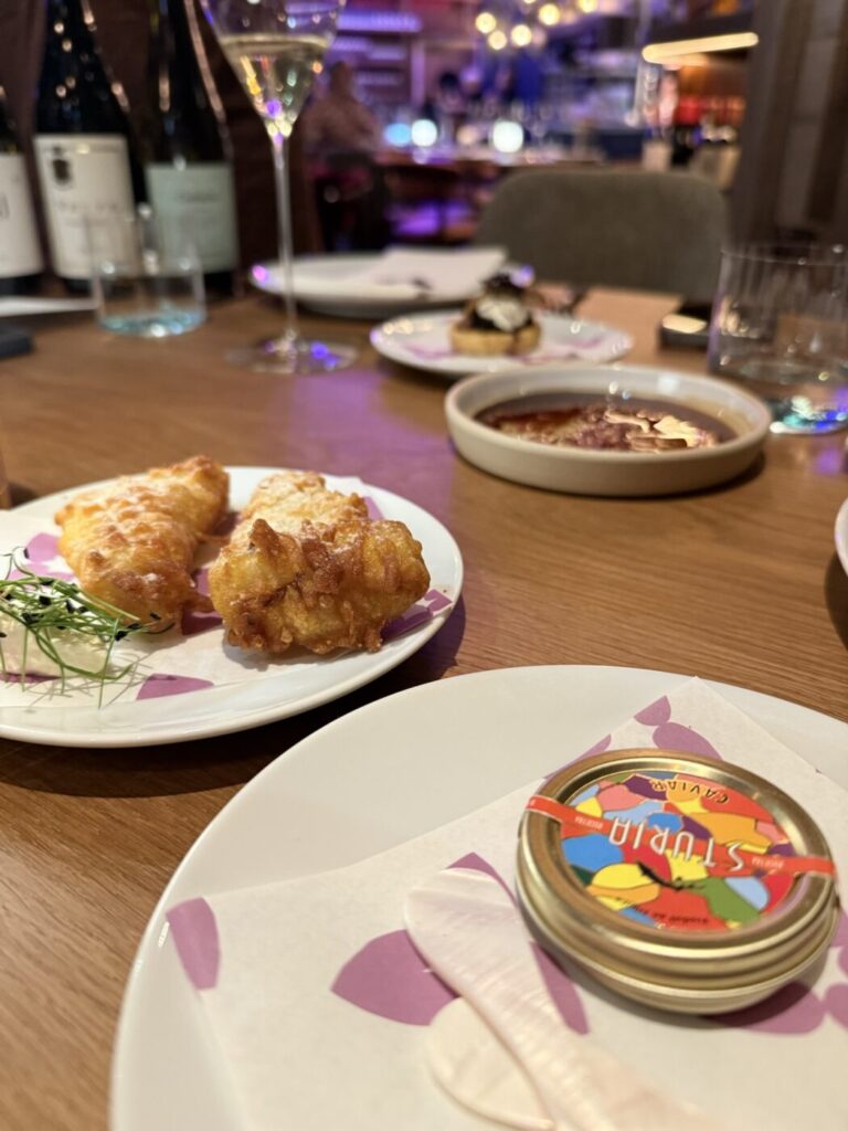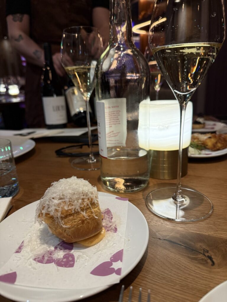 The menu is big and punchy, and although the narrative is to order as little or as much as you like, nobody is leaving here cheaply. It’s a little bit Lita and Dorian, a big bit Noble Rot, with plenty of Glynn’s raconteur style littered throughout. We start with the ubiquitous milk loaf, with a puddle of chicken fat, malt vinegar and pink peppercorns to dredge through. It instantly feels fresh, a witty take on olive oil and balsamic. A giant gourgere filled with mustardy-cheese sauce is a gloriously messy affair at £6, whilst the potato rosti with salt and vinegar powder comes alive with the saline hit of a caviar supplement. Linda, Sophie’s very wonderful mom, gets the seaweed palmier with anchovy and what I believe to be a ricotta. She absolutely loves it. These are washed down with a lovely champagne, an important fact given that one half of the business is a wine merchant.