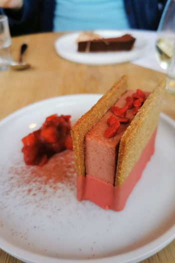 Mains up the ante. My gnocchi might have a touch too much flour in the mix, but the squash sauce is wonderful stuff; properly seasoned and with a back note of fennel seeds. And no qualms at all with the lamb rump; accurately medium, fat rendered, with a fried potato terrine. That terrine is the highlight of the meal, maybe the week, possibly the month. Decadently ovine, burnished layered spuds heavily dusted in sea salt, it could stand alone as a starter, yet here with the lamb and the sauce lightly spiked with tarragon it’s properly glorious.